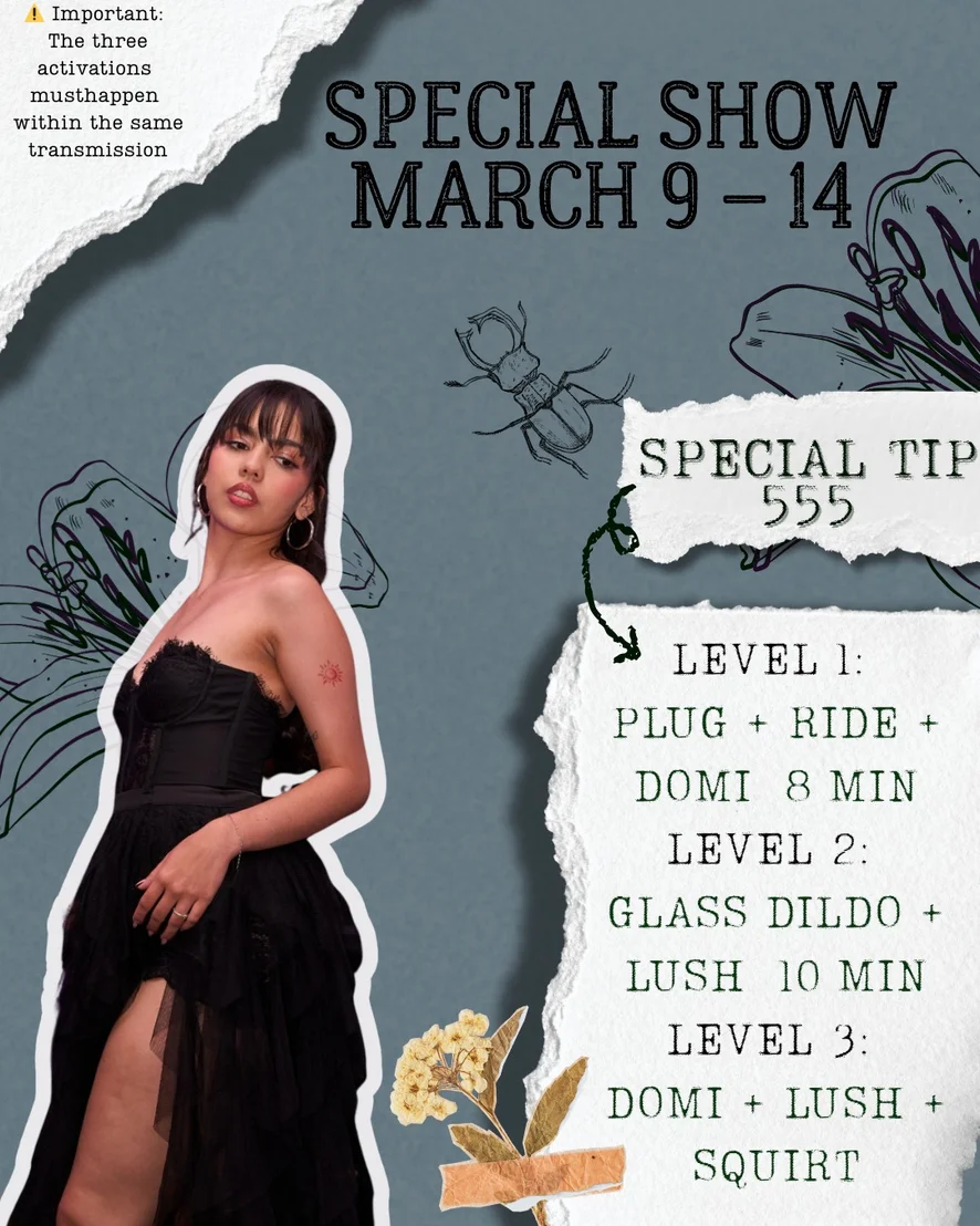 🔥 SPECIAL SHOW 🔥 📅 March 9 – 14 💎 Special Tip: 555 During this week I’ll be doing a special dynamic in my live streams. ✨ How does it work? Send the 555 tip to start unlocking rewards. If you send more than one 555 tip in the same stream, you will unlock 3 different levels. Each level unlocks the next one. 🎁 Rewards: 1️⃣ Level 1: Plug + Ride + Domi — 8 min 2️⃣ Level 2: Glass Dildo + Lush — 10 min 3️⃣ Level 3: Domi + Lush + Squirt ⚡ The more 555 tips you send in the same stream, the more you unlock